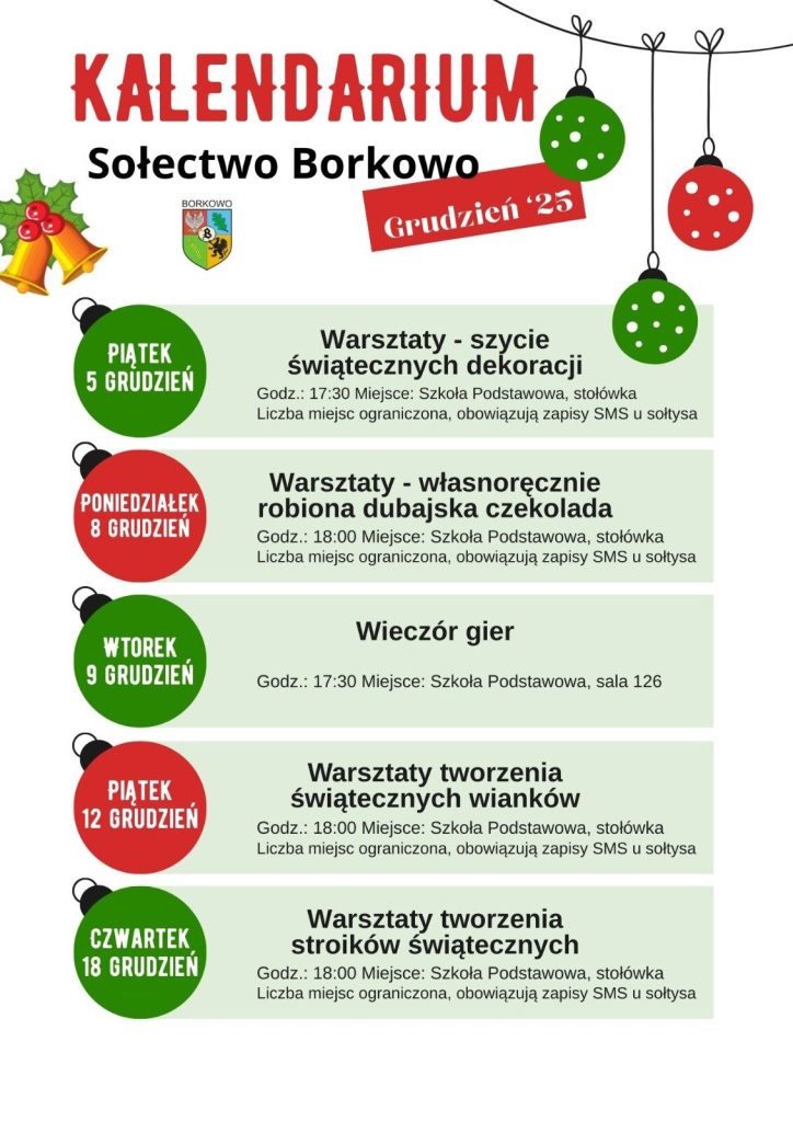 Sołtys Mariusz Szymański zaprasz mieszkańców Borkowa na twórcze, przedświąteczne spotkania w postaci warsztatów szycia ozdób świątecznych, robienia czekolady dubajskiej, tworzenia wianków i stroików światęcznych, a także wieczór gier. Warsztaty odbędą się w Szkole Podstawowej w Borkowie w dniach 5, 8, 12 i 18 grudnia.